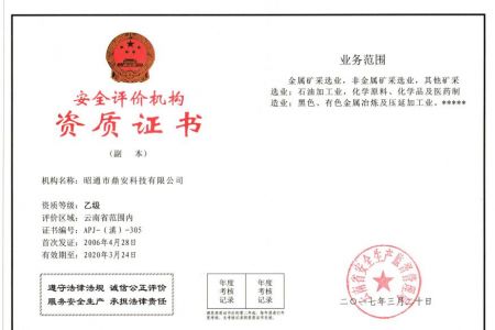 2003年11月10日,昭通市鼎安科技有限公司成立,初始主要從事第三方安全工程技術服務,經多年運營,發展為多專業綜合科技平臺,為社會提供多種專業技術服務工作。 現公司注冊資金為1200萬元,公司法定代表人:毛衛旭。公司主要業務:安全評價、安全標準化評審、安全工程技術服務;環境監測、職業衛生檢測、檢驗;法律訴訟及非訴訟服務;司法鑒定、固定資產投資項目節能服務;工程咨詢;工程測量測繪;安全教育培訓等。是安全生產服務、安全教育培訓機構,也是環境監測和職業衛生服務機構,同時也是綜合的檢測檢驗、綜合科技平臺服務機構。多年來為公、檢、法、司、軍、警、海關、仲裁、安監、工礦商貿企業、社會團體及個人提供多專業技術服務。